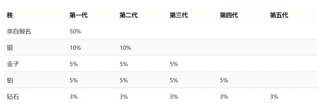 举例来说,如果您是白金级别,您还将获得黄金和白银级别的世代匹配。因此,您的第二代银牌中的某人也可能是您的第一代金牌和您的第一代白金牌,因此您将获得 10% 的第二代银牌匹配、5% 的第一代金牌匹配和 5% 的第一代白金匹配在那个人的整个矩阵上!