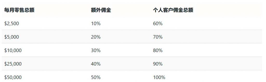 零售佣金的支付遵循与快速启动佣金相同的支付结构。不同于仅支付一次的快速启动佣金,零售客户每次下订单都可以无限次赚取零售佣金。